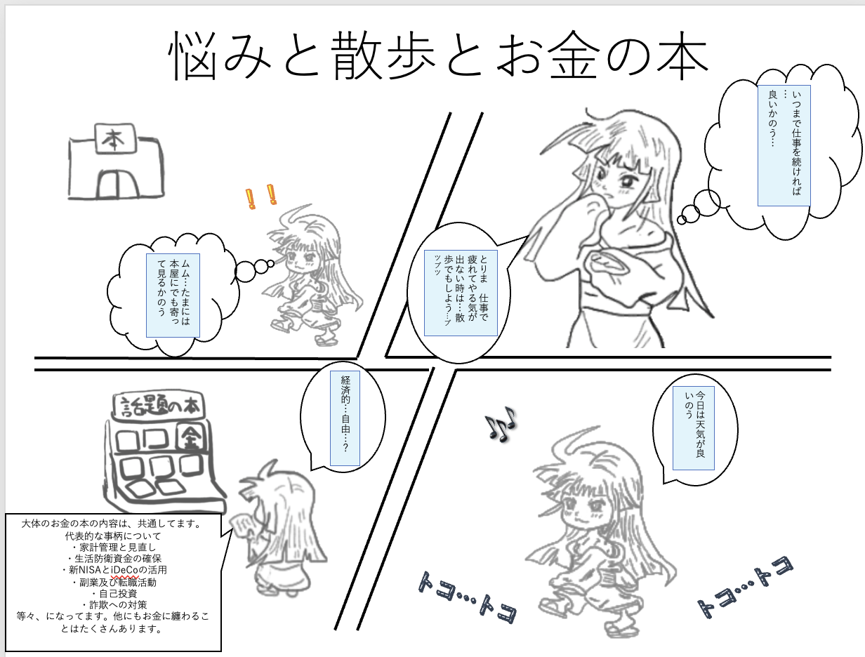 しかしながら、この悩みをずっと頭の中でループしててキリがないです。では、どうするか?2コマ目に続きます。